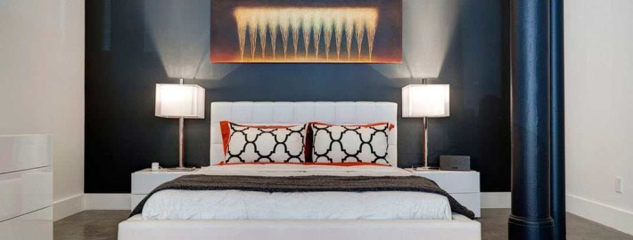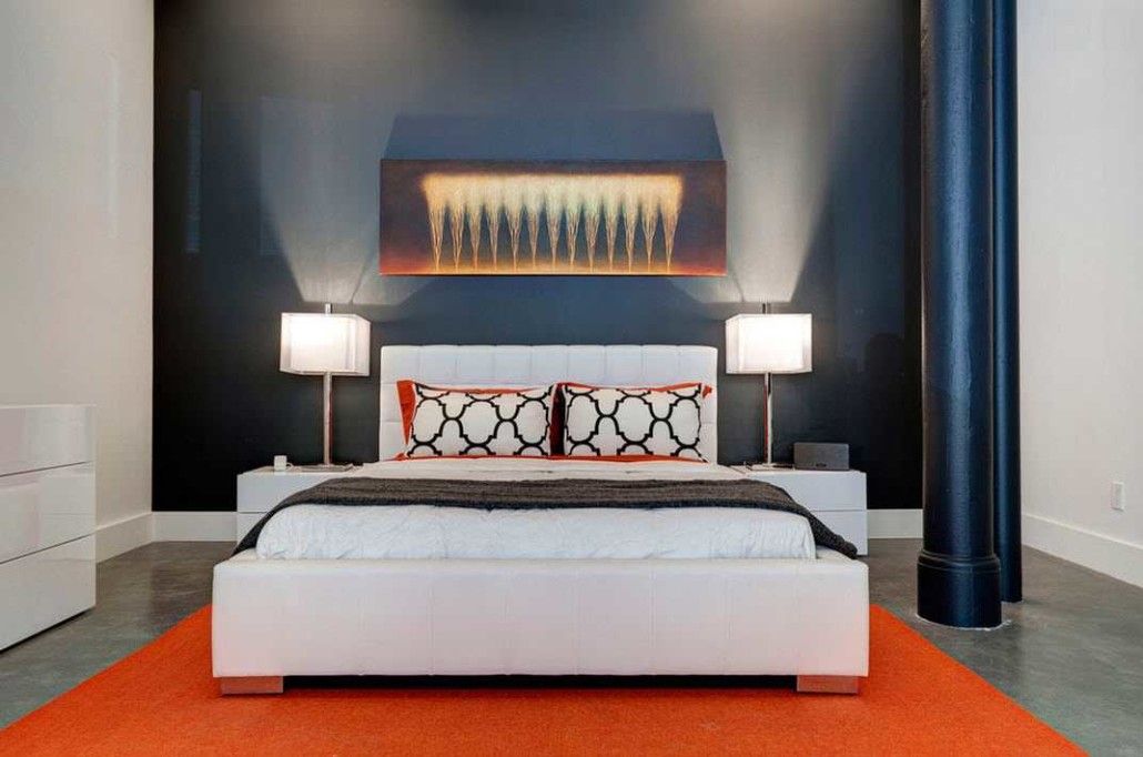 Ну а следующий интерьер темной спальни явно предназначен для экстравагантных личностей. Сочетание черного, белого и красного отражают индивидуальность творческих натур, подчеркивая их неповторимость. А пушистое покрывало добавляет мягкости и изящности.