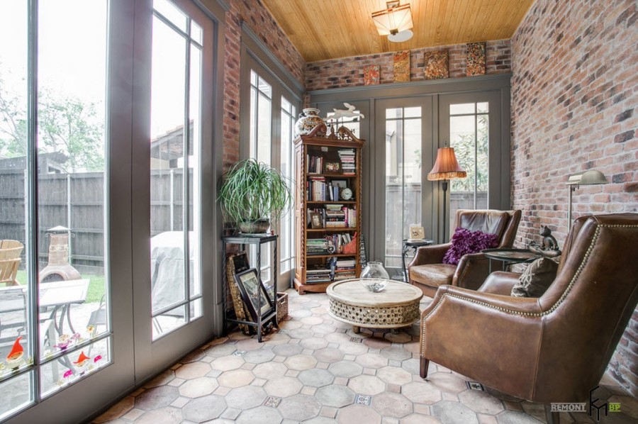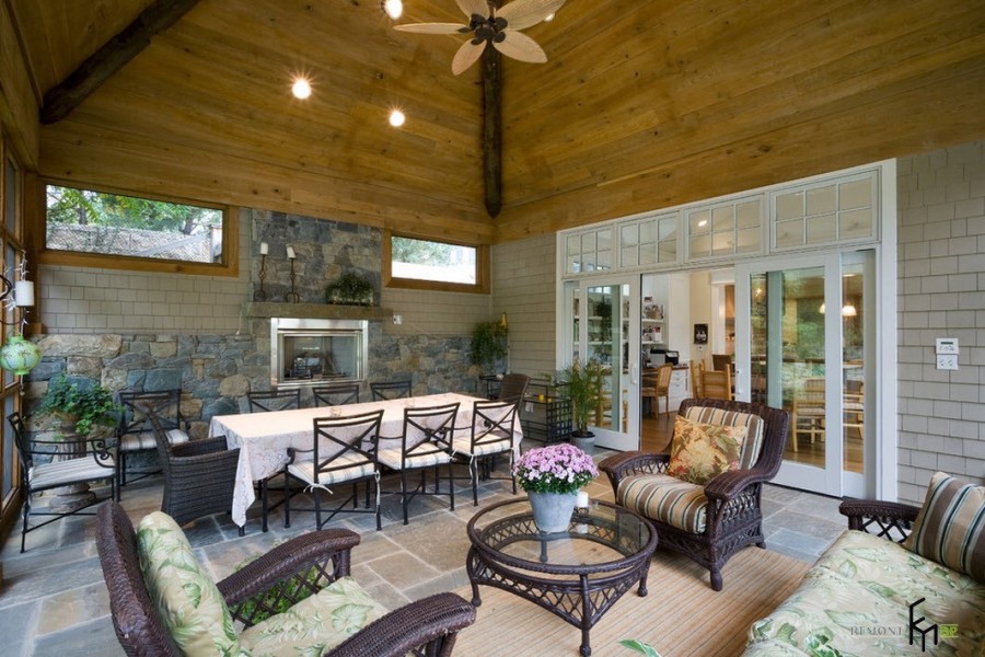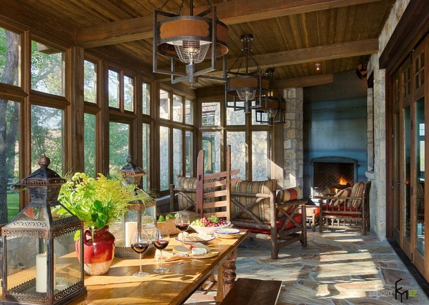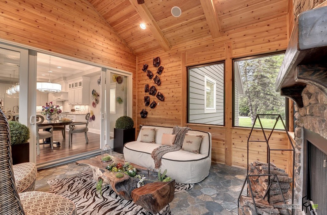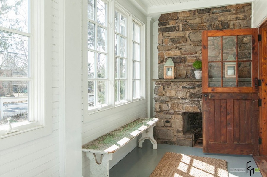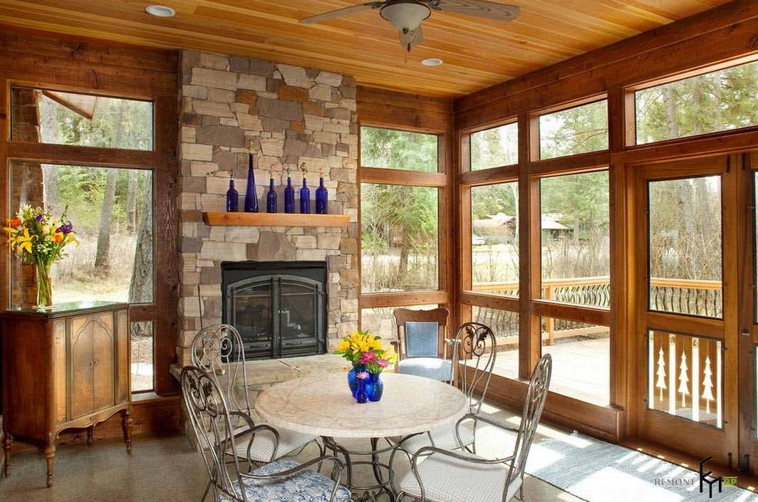 Отделка пространства возле камина или печи с помощью каменной кладки, привносит в интерьер веранды дух старины, ощущение прочности и надежности. Не говоря уже о том, что это невероятно практично с точки зрения обслуживания и долговечности обработки любой поверхности.