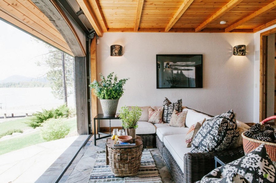 Присутствие скандинавского стиля ощущается в светлой отделке всех поверхностей веранды и в ярких вкраплениях текстиля и декоративных элементов.