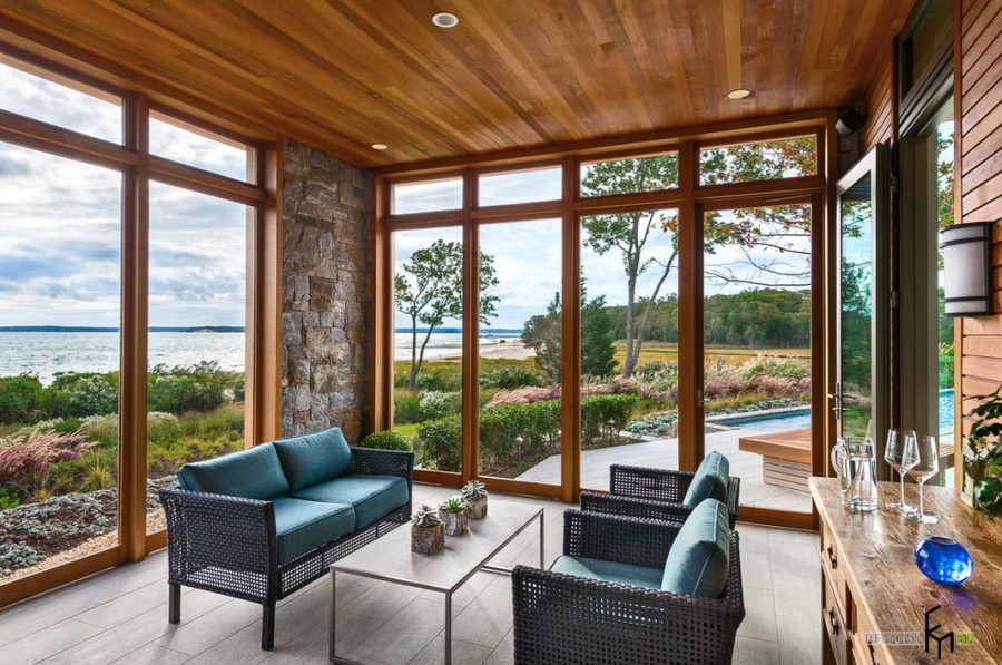 Применить природный камень можно не только для облицовки пола веранды, но и для сооружения фундамента. Невероятно гармонично смотрится практически необработанный камень в сочетании с необтесанными рамами больших окон. Создается ощущение, что домочадцы находятся в лесу, а не в комфортабельной даче, настолько удачно веранда интегрирована в окружающую природу.