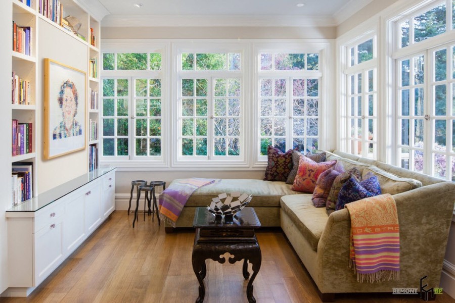 Белизна оконных рам и потолка перекликается с таким же оттенком обивки мебели и напольного торшера, а глубокие коричневые тона деревянных предметов интерьера придают теплоты и контраста помещению террасы.