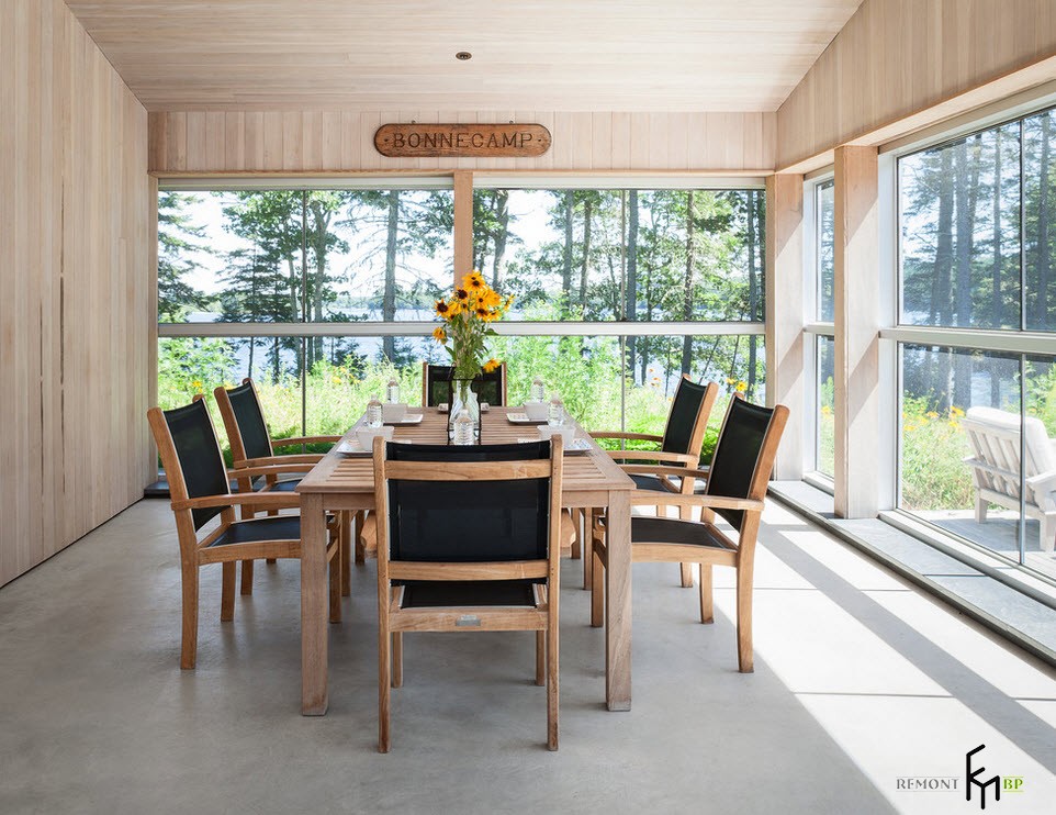 Эта просторная и светлая веранда используется исключительно как обеденная зона. В таком комфортном и уютном помещении приятно собраться всей семьей, ужинать, общаться и наслаждаться шикарными видами природы за окнами.