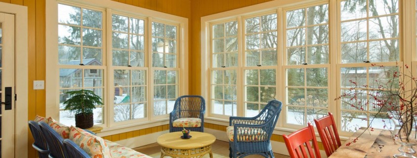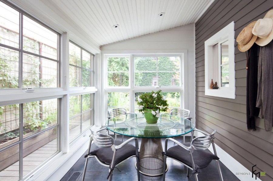 Классическое сочетание белых оттенков потолка и оконных рам с темным цветом полов и одной из стен придает уникальный характер даже самому небольшому помещению крытой террасы.