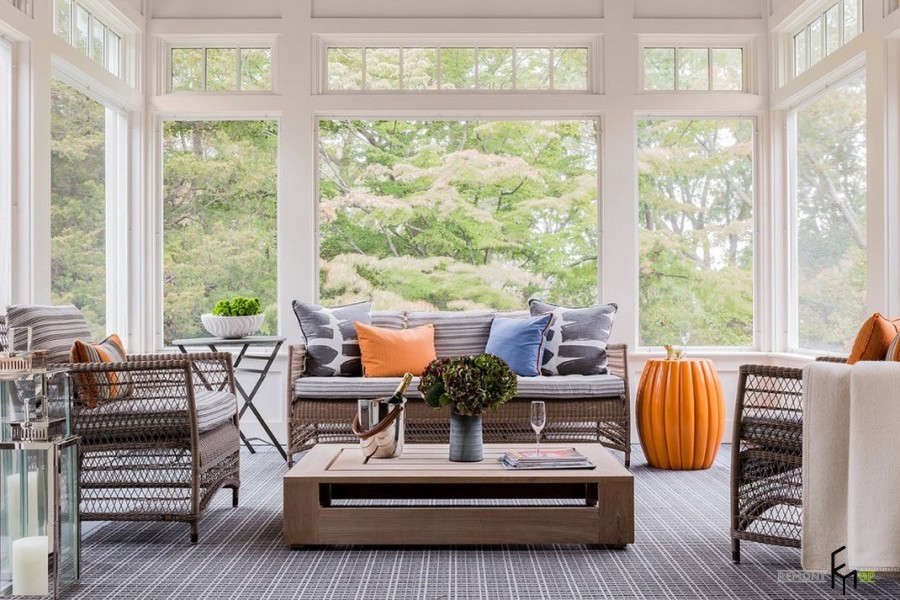 Светлая и нейтральная обстановка веранды служит прекрасным фоном для координационного центра веранды – большого камина-печи, занимающего все пространство от пола до потолка. Яркая обивка мебели и цветной напольный коврик разбавляют эту монохромность.