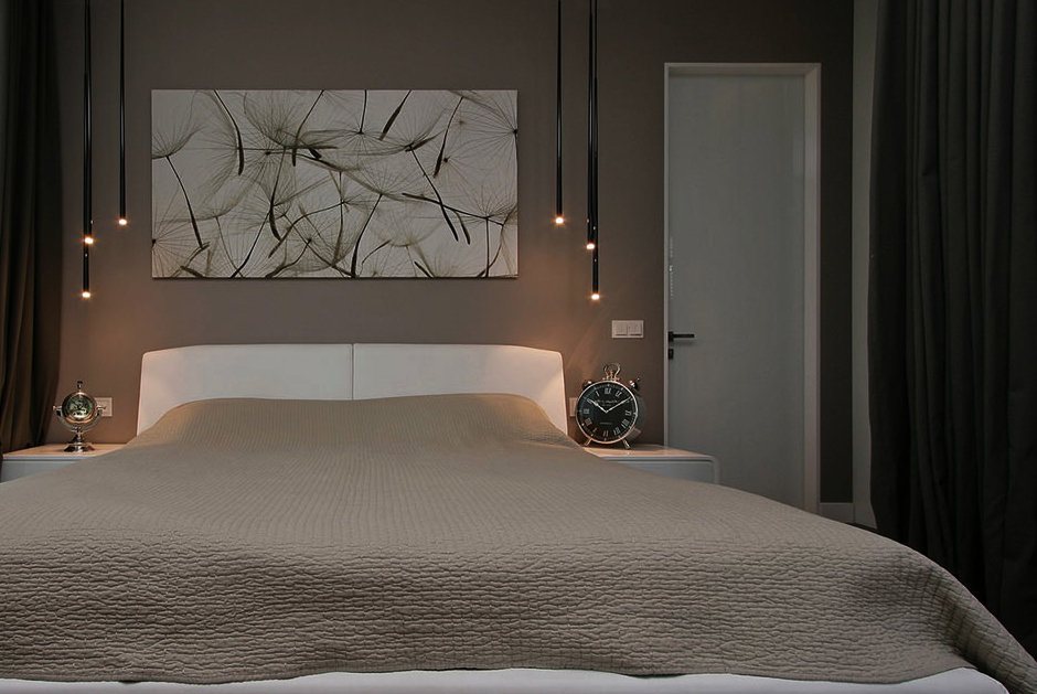 Настенные ночники, расположенные над головой или сбоку кровати, экономят пространство, но требуют более сложной установки. Если вы заботитесь о минималистском, современном характере интерьера и в то же время имеем достаточно просторную комнату, выбирайте подвесные светильники для спальни.