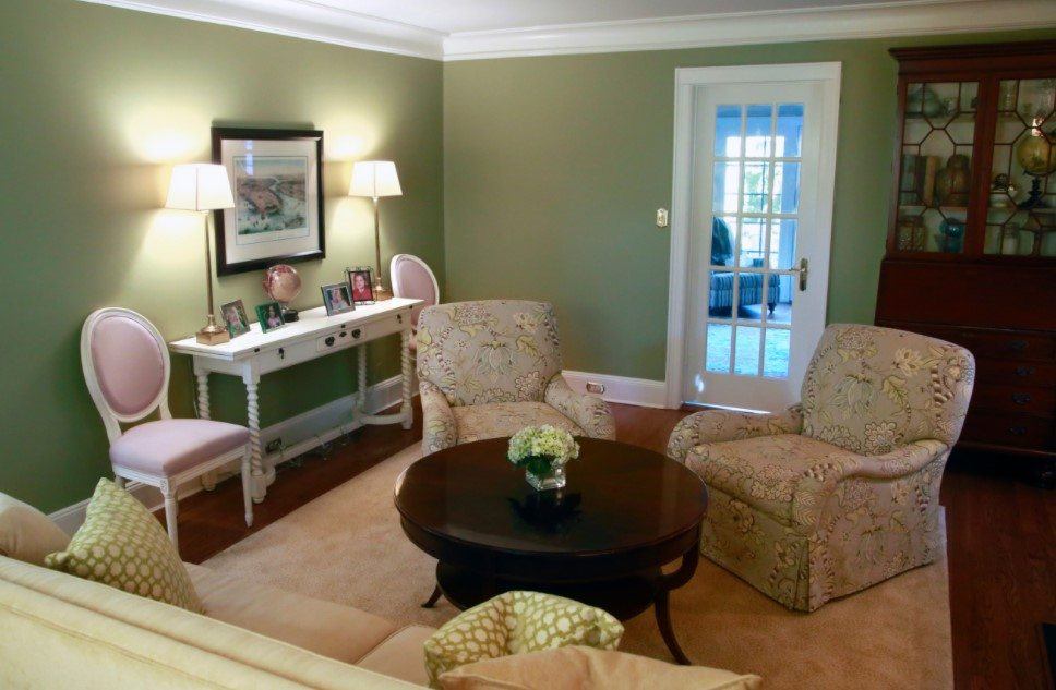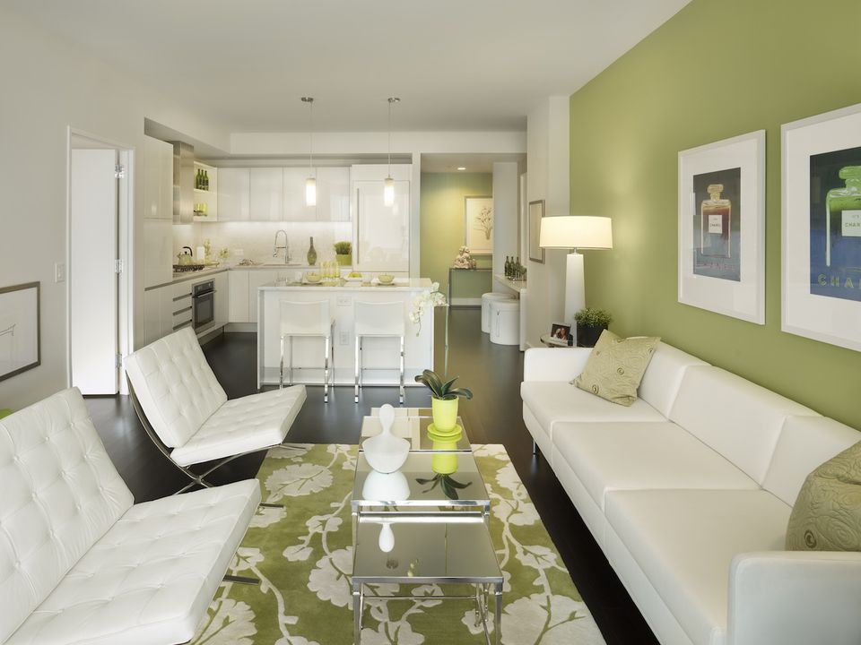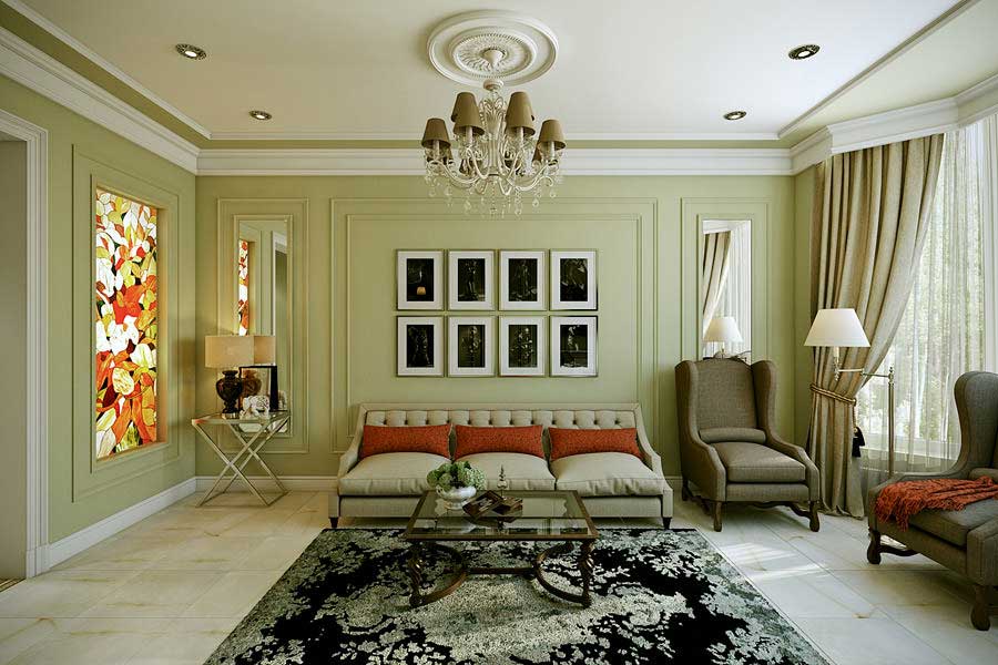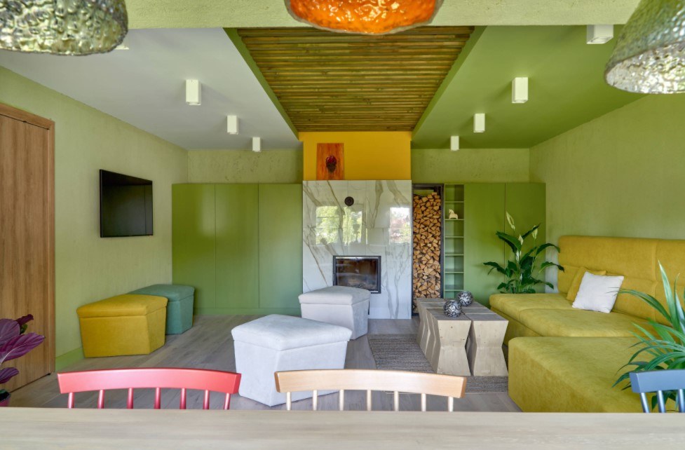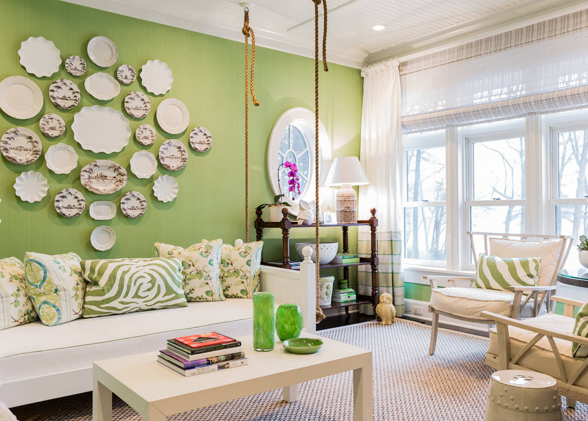 Обеденная зона в летней гостиной может быть оформлена с использованием ярких стульев из ротанга или пластика разных оттенков и форм. Также можно выбрать стол с фигурными элементами и дополнить его зелёными стульями. Мягкий и пушистый ковёр добавит уюта, а стильная люстра создаст атмосферу веселья.