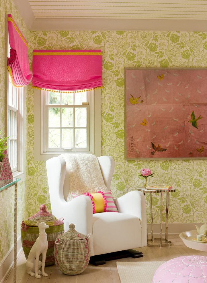 - обои с насыщенными, но легкими для восприятия оттенками (желтый, зеленый, голубой, розовый, оранжевый) сделают комнату уютной, солнечной и теплой;
