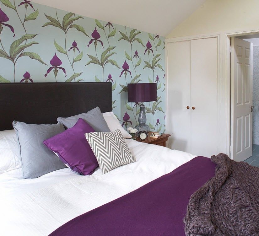 - в качестве декоративного акцента можно использовать яркие насыщенные обои. Но чтобы не перегружать интерьер, поклейте их на стену за изголовьем кровати;