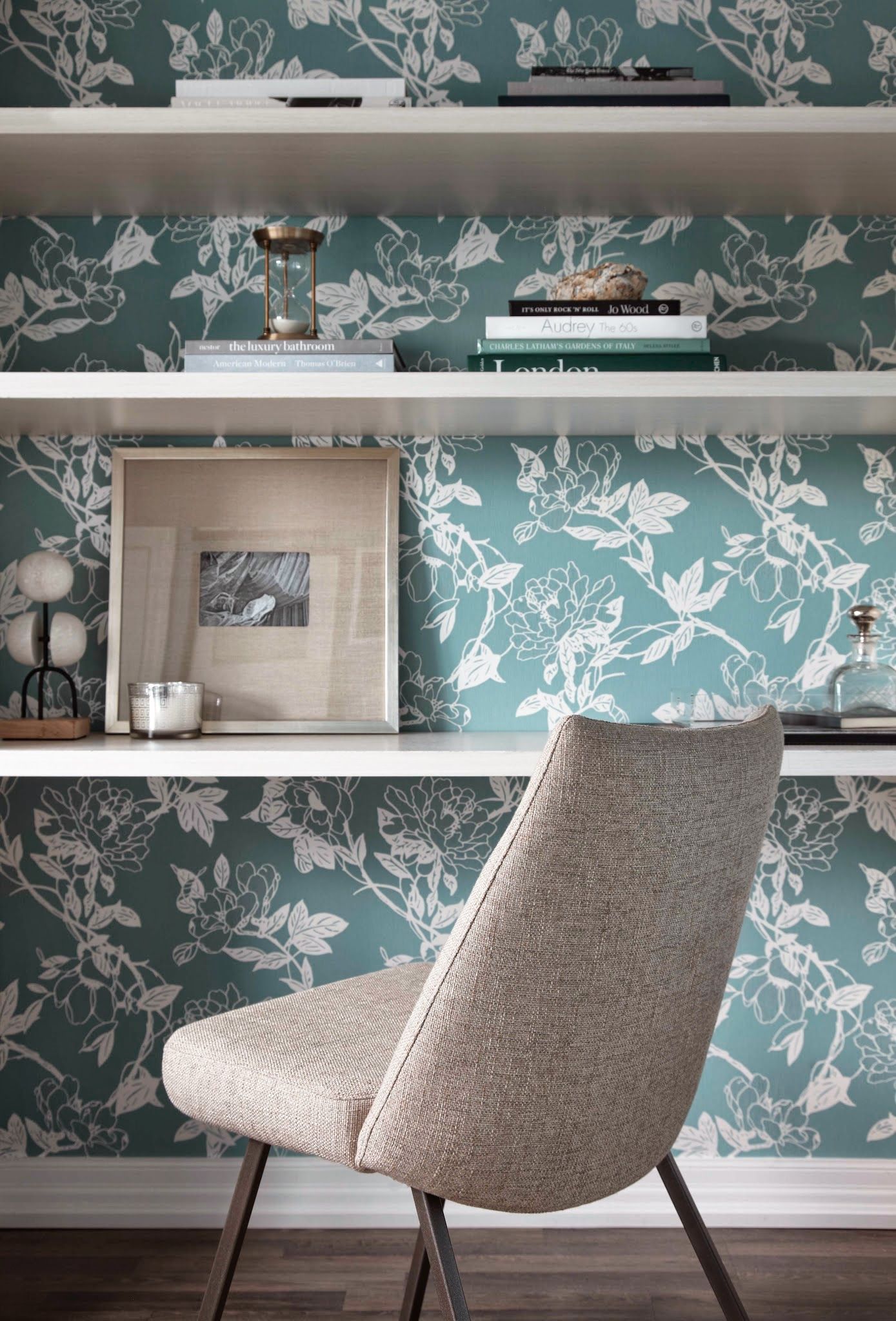 - рабочая зона требует концентрации, поэтому здесь лучше использовать однотонные обои. Допускаются и броские цветочные детали, но при этом они должны повторяться и в других элементах дизайна;