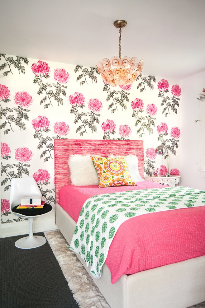 - эффектно дополнить цветочный принт на обоях можно продублировав его на текстиле и аксессуарах.