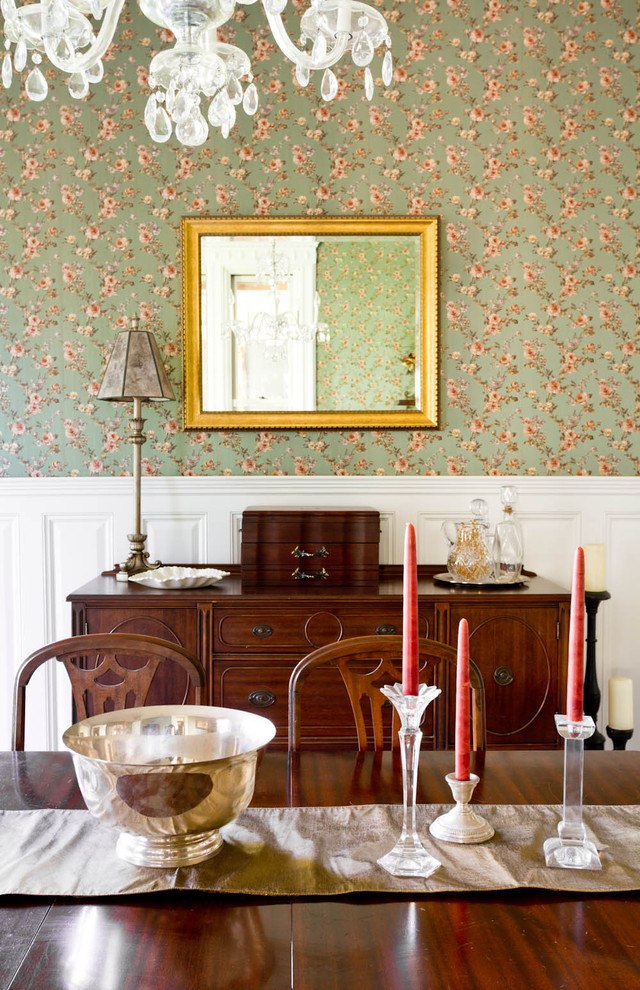 Очень популярны обои с цветами и в классических интерьерах. Зачастую это повторяющийся мелкий узор. Традиционные цвета – бордовый и красный, а также штрихи черного и золотистого. Спокойные пастельные природные мотивы на обоях также прекрасно смотрятся в роскошной классической комнате.