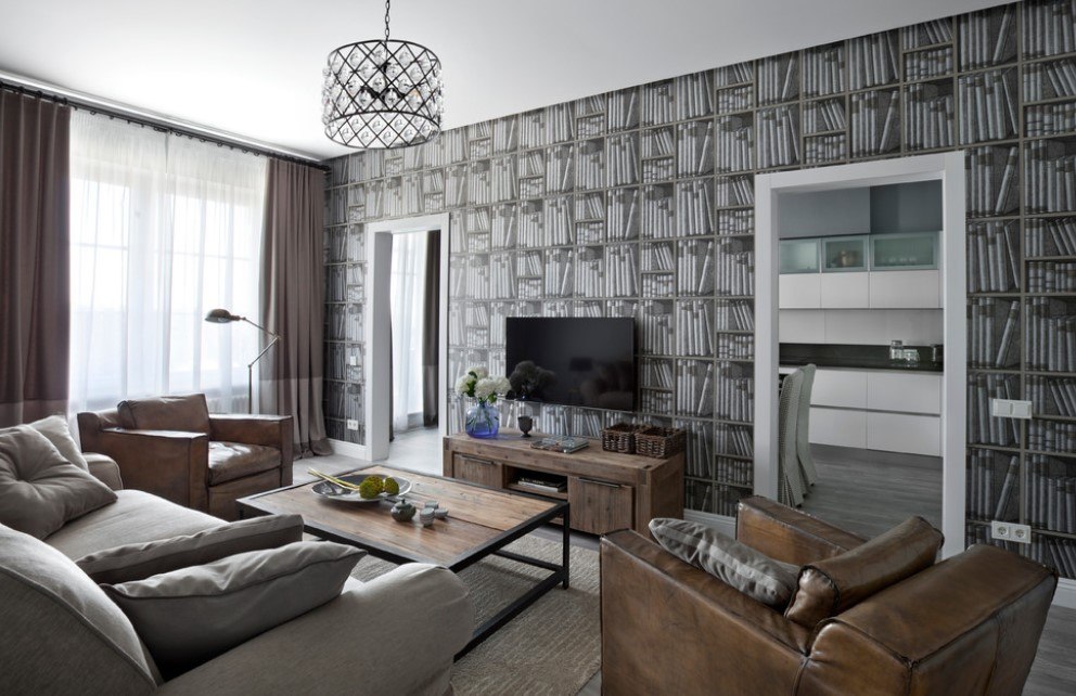 Такие обои будут прекрасно сочетаться с мебелью из натуральных материалов и присущим стилю «лофт» открытым коммуникациям.