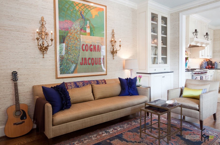 Декорируйте гостиную фотообоями. Коллекции, выпущенные в новых форматах, нужно лицезреть воочию – слова не способны передать эмоции. Райский уголок или пейзаж пропишутся только в исключении соседства с крупными принтами основного фона, и резкого контраста. Весь «изюм» – в тональном совпаденени фона и заставок.