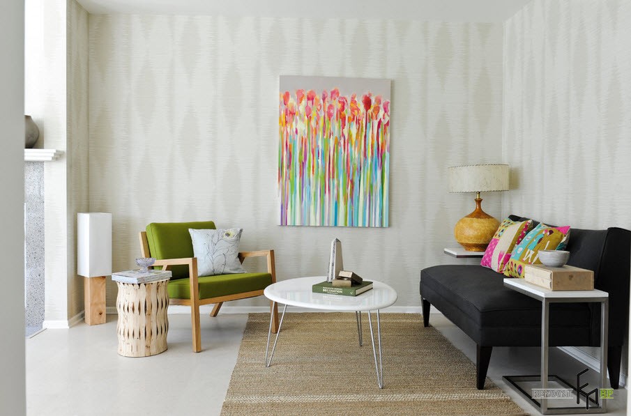 Разнообразие выбора предполагает креативные приемы. Стало модным совмещать в одной комнате несколько рулонов из разных коллекций, не всегда совпадающих по текстуре, и тем более по цвету. Схемы комбинаций варьируются в зависимости от фантазии без оглядки на консолидирующую поддержку. Впрочем, цветовой разброс допустимо объединить перемеживающими полосами, гармонирующих с фоном. А если срифмовать настенный декор с текстилем на окнах и обивке, и создать «ловушки» для разноцветных зайчиков посредством стеклянных светильников и акссессуаров, жить вы будете в динамичном пространстве.