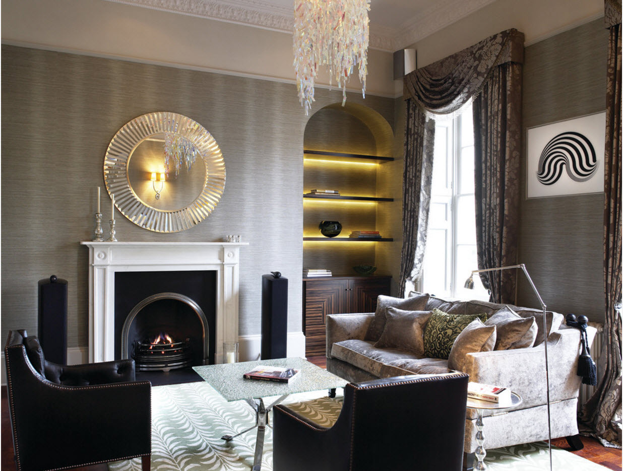 Текстильные обои выглядят роскошно, обладают высокими экологическими свойствами, способны «дышать». Но у такого отделочного материала немало минусов – помимо достаточно высокой стоимости, поверхность нельзя очищать при помощи средств (необходимо очень аккуратно относиться к эксплуатации подобной отделки). Если раньше можно было увидеть в гостиных в основном красивые бархатные, велюровые ткани на стенах, то последние тенденции в формировании современного стиля диктуют использование хлопка и льна. Для минималистских, строгих, лаконичных гостиных такой вид отделки можно использовать не только для акцентных поверхностей, но и всех стен помещения.