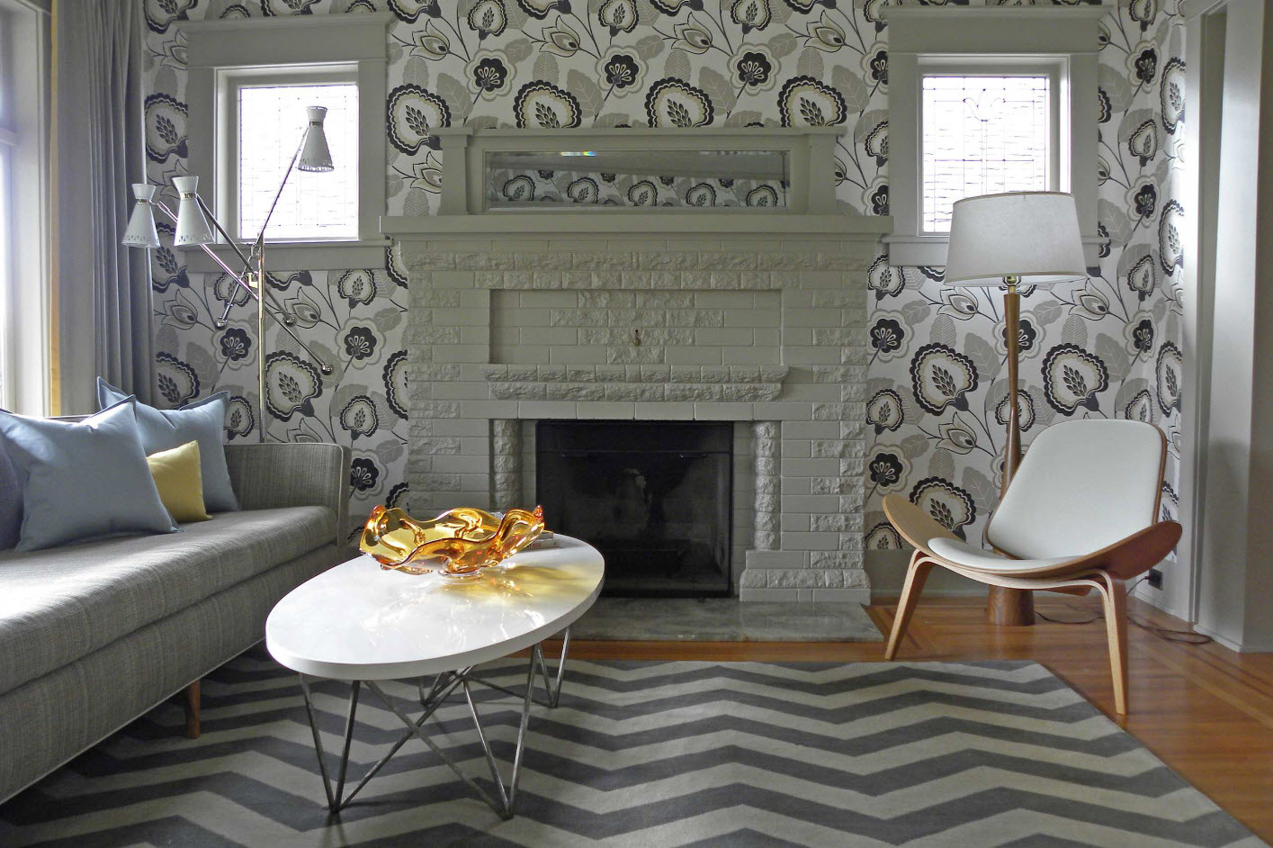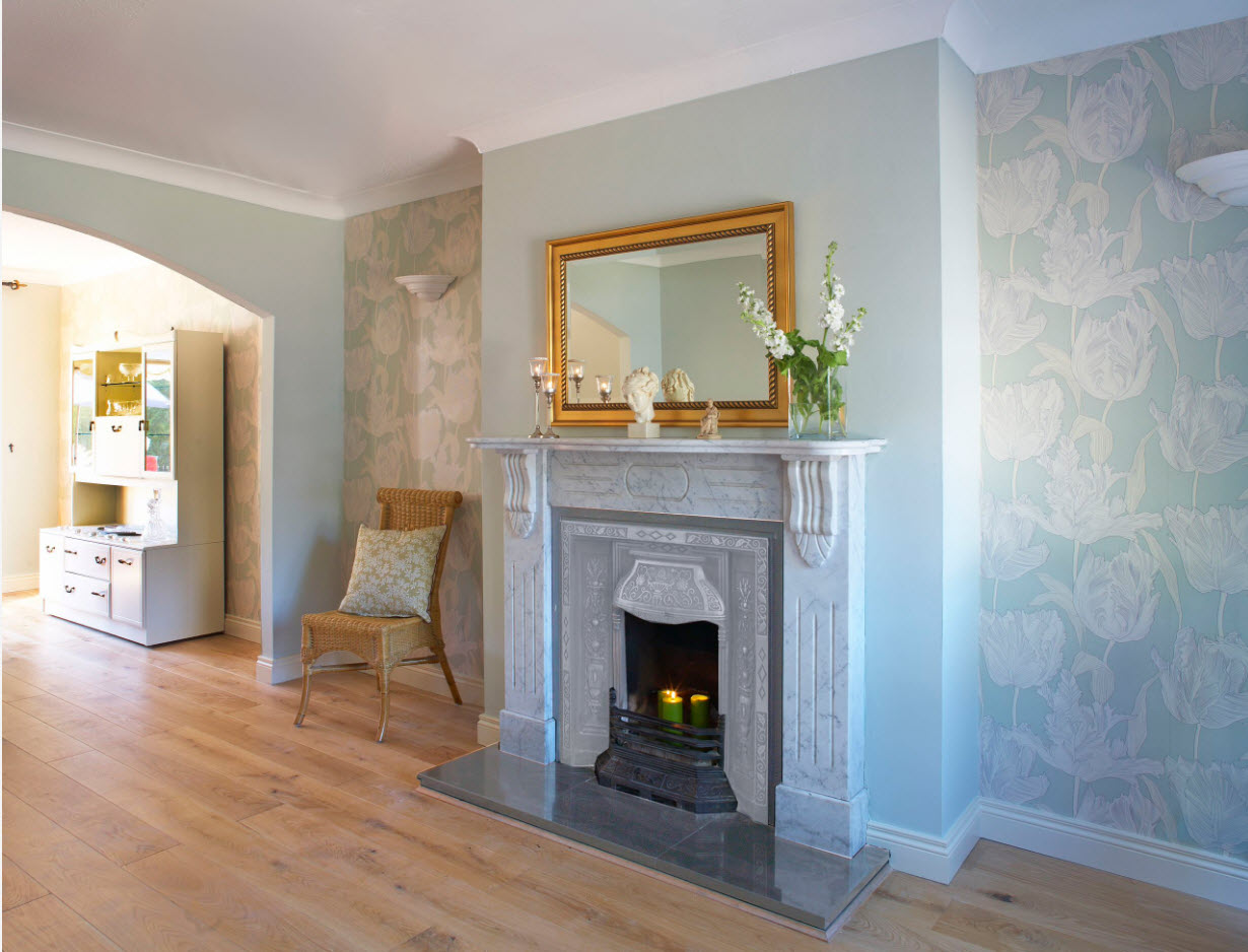 Красивые обои, отличающиеся от основного фона помещения по цвету, принту или фактуре можно использовать не для всей стены, а только для ее части. Например, можно выделить дымоход камина (ту его часть, которая не подвергается воздействию пламени, не нагревается интенсивно).