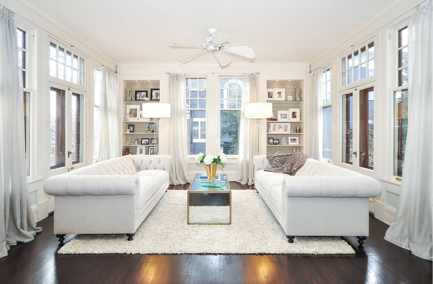 Светлая палитра никогда не выйдет из моды. Тем более, что квартир с гостиными малых размеров в нашей стране достаточно. Старый жилой фонд изобилует комнатами с площадью не более 15 кв.м. Такое помещение нуждается в светлой цветовой гамме для отделки стен, способной визуально увеличить объемы помещения. Но это не означает, что необходимо использовать исключительно белый цвет. Можно применить дизайнерский прием акцентной стены для одной поверхности и использовать обои с рисунком (на светлом фоне) или создать фактурный акцент, применить обои с тиснением, отличающиеся лишь блеском и видным только под определенным углом узором.