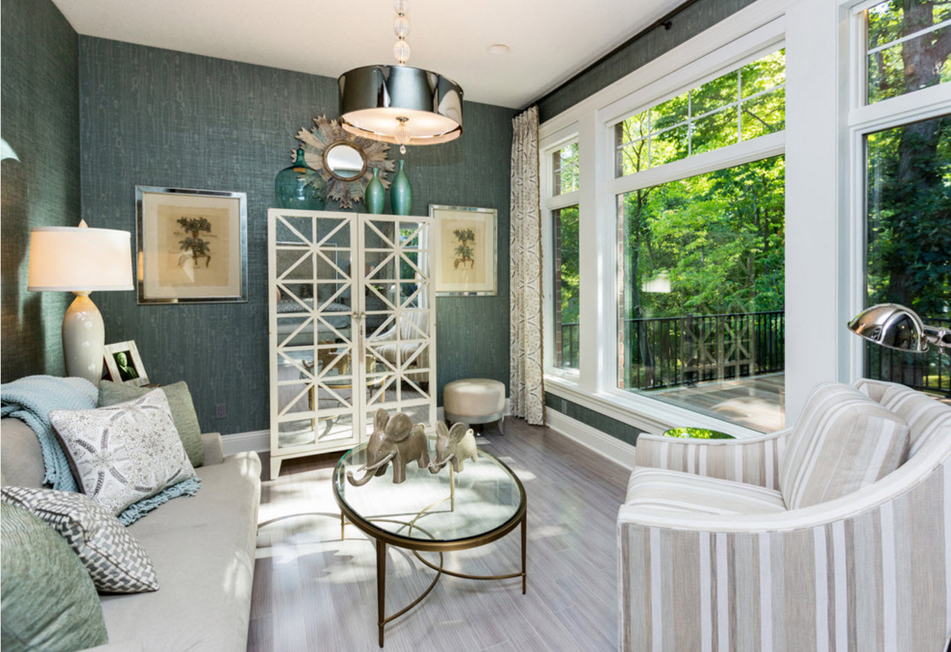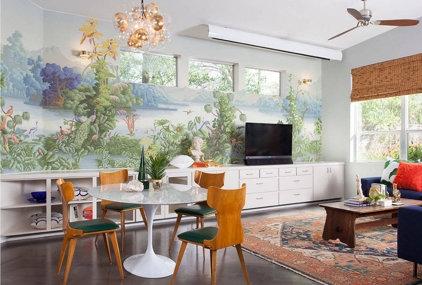 Растительная и анималистическая тематика в коллекциях отделочных материалов с принтом имеет явный восточный уклон. Не только растения, но и птицы, животные, насекомые становятся «участниками» интерьера гостиной. Как правило, такие обои выглядят как художественная роспись и создают совершенно особенную атмосферу помещения гостиной. Уникальность интерьера вам будет обеспечена.