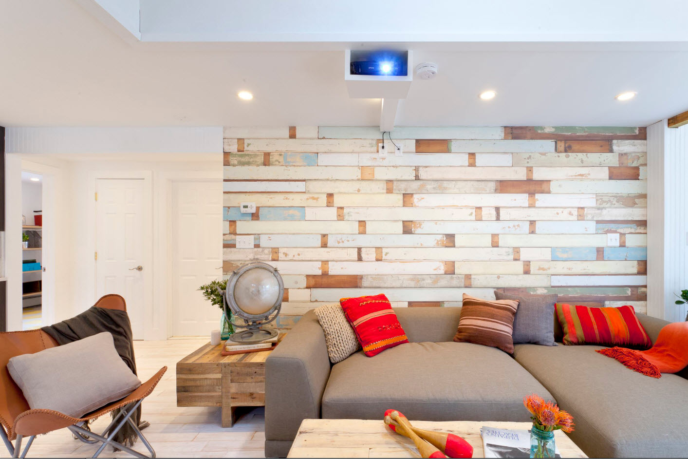 Не меньшего эффекта можно добиться при оклеивании межкомнатных перегородок, призванных зонировать совмещенное пространство, в котором помимо гостиной, располагаются другие функциональные сегменты.