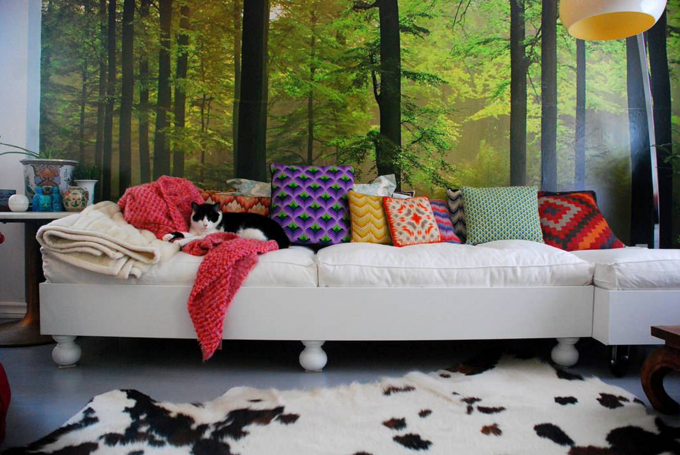 Если говорить об имитациях более обширно, то к этому виду отделки можно отнести использование фотообоев, создающих иллюзию оформления стен. Можно создать ощущение отделки поверхностей тканью, мягким мехом или колючками, расположить фото кирпичной стены с дырой или зеленой лужайки с уходящей вдаль перспективой.