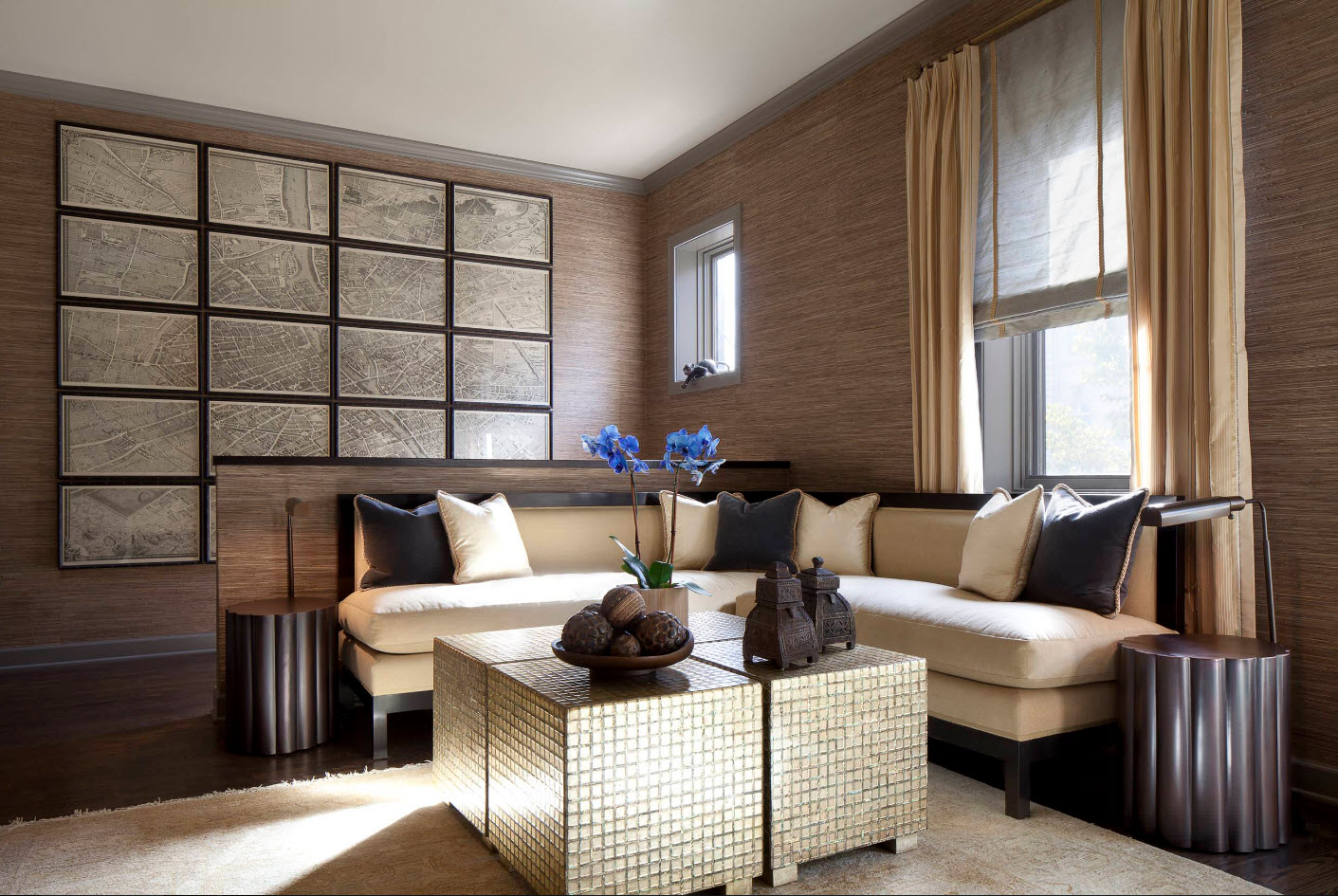 Металлизированные обои хотелось бы выделить в отдельную группу. Хоть они могут быть произведены из различного сырья и обладать разными свойствами, но роднит все типы присутствие золотистого, серебристого или медного блеска в составе материала. Где как не в гостиной можно позволить себе нотки роскоши. Даже в лаконичных современных интерьерах металлический блеск акцентной стены способен создать особое настроение, повысить градус оригинальность и элегантности образа помещения.