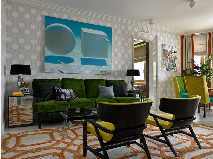 Если говорить о полотнах с рисунком, то актуальными считаются полотна с геометрическим и абстрактным принтом. При этом важно сопоставить размеры помещения, яркость и пестроту геометрического рисунка на обоях. Если помещение небольшое, то полотна с крупным рисунком лучше использовать только на одной стене, в качестве акцентного элемента. Светлый, некрупный геометрический принт можно использовать и на всех стенах в гостиной среднего размера.