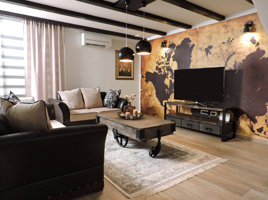 Применение фотообоев не утратило популярности. Идеальный способ создания акцентной стены – использование интересного изображения, созданного на полотне пи помощи фотопечати. Это может быть огромный семейный портрет, красивый пейзаж, абстракция или тематическое изображение. Главное, чтобы сюжет на фотообоях находился в гармонии с общей концепцией оформления гостиной.