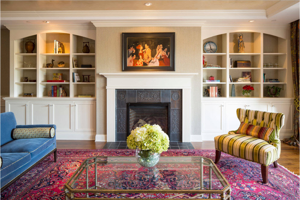 И еще один способ применения обоев в пространстве гостиной – оклеивание внутренней части стеллажей или шкафов с открытыми полками (стеклянными дверцами). Таким образом, можно и привнести цветовой акцент в дизайн помещения, привлечь внимание к содержимому стеллажей. Помимо этого, с помощью такого оклеивания можно дать, что называется «вторую жизнь» старым стеллажам или открытым полками.