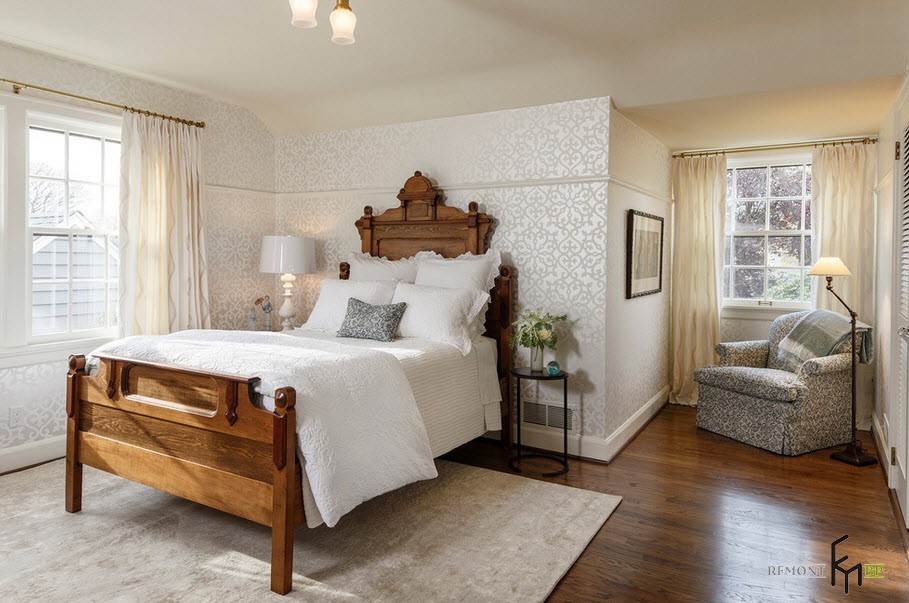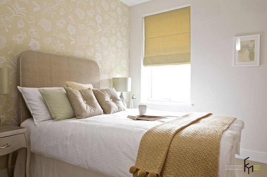 Например, стили прованс или кантри предполагают однотонные обои природных оттенков. Как вариант можно использовать имитацию на обоях кирпичной кладки или изображения растений. Простота и уют такой спальни предполагают спокойное времяпрепровождение за чтением книги или вязанием.