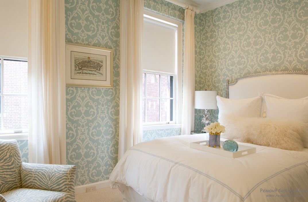Также нужно внимательно отнестись и к выбору самого рисунка. Если будут выбраны обои с орнаментом, то заказывая шторы, нужно будет отдать предпочтение тканям без каких-либо изображений.