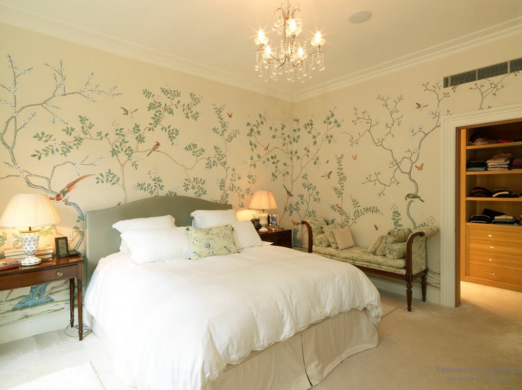 Учитывая, что при обстановке спальни используется минимум декоративных предметов, завершенность образа этой комнаты можно достичь при правильном выборе обоев.