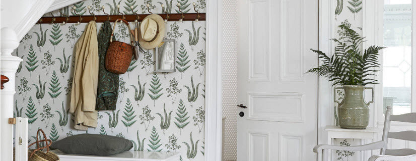 А в помещении прихожей с помощью отделки с принтом можно оформить нишу, акцентную стену или ее часть. При этом можно использовать дорогие обои, расход полотна все равно будет минимальным. Такой поверхностью может стать стена с вешалкой или параллельная поверхность, зона размещения верхней одежды (можно использовать моющиеся обои) или место с зеркалом (возможно использование дорогих полотен, фотообоев).