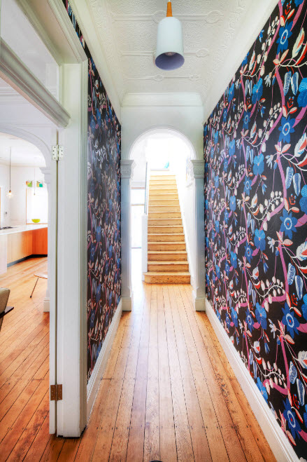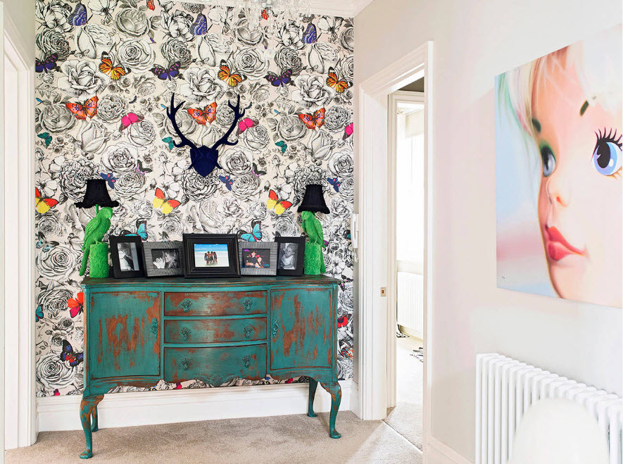 С помощью обоев с принтом несложно создать акцентную поверхность. Такой дизайнерский прием возможно выполнить даже в помещениях средних и малых размеров. Например, в узком коридоре можно оклеить обоями с рисунком стенку, в которую он упирается…