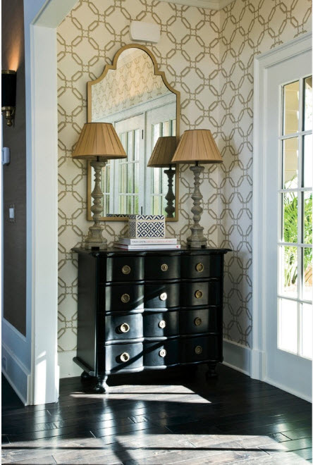Текстильные и металлизированные (имеющие серебристый, золотистый или медный блеск полотна) обои в интерьере прихожей используются крайне редко и то, в основном для отделки верхней части стен или потолка. Дело не только в достаточно высокой стоимости (особенно по сравнению с бумажными обоями), но и низкой устойчивости отделки к влаге, различным видам механических воздействий и загрязнений.