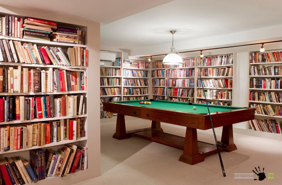 Игровая зона или библиотека – сложно сказать при первом взгляде на эту комнату. Очевидно одно, домовладельцам удалось органично совместить два своих пристрастия – к книгам и бильярду.