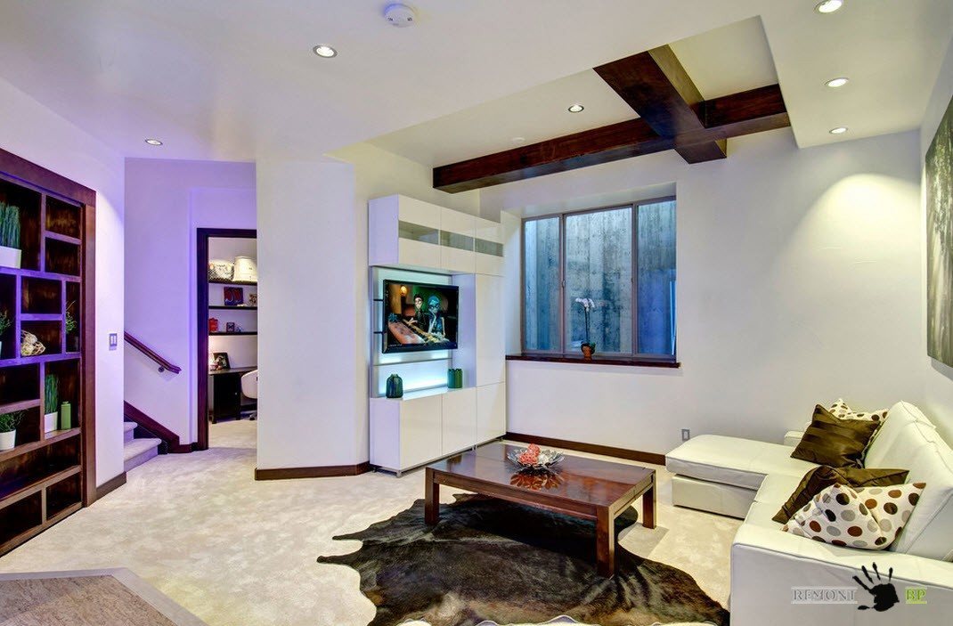 К вопросу обустройства полуподвальных помещений и цокольных уровней – следующий образ комнаты для отдыха создан именно в таком пространстве. Оригинальная отделка с намеренно не выровненными белоснежными стенами нашла сове продолжение в ковровом покрытии аналогичного оттенка с длинным ворсом. А мягкая мебель в шоколадных тонах, оригинальные подставки и яркие подушки составили обстановку зоны отдыха.