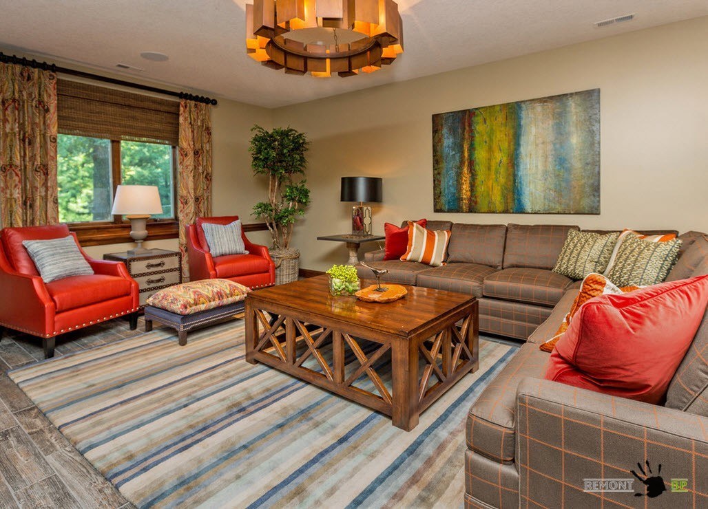 Яркий, колоритный интерьер комнаты для отдыха можно получить и в помещении с нейтральной отделкой. С помощью кресел с кожаной обивкой насыщенных оттенков, оригинального настенного декора, дизайнерской люстры, пестрого текстиля диванных подушек, оформления окон и коврового покрытия, можно получить действительно оригинальный дизайн гостиной, запоминающийся и нетривиальный.