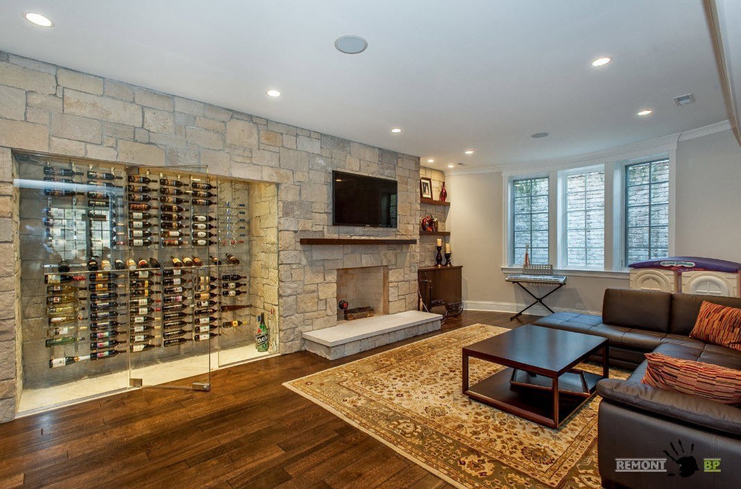 В данной гостиной камину не суждено было стать координационным центром и сфокусировать внимание на себе, потому что большую часть из стен достаточно просторной гостиной занимает винный шкаф с прозрачными дверцами, позволяющими лицезреть всю коллекцию благородных напитков. С помощью отделки «под камень» удалось воссоздать некоторое подобие обстановки винных погребов с их прохладой и совершенно особенным колоритом.