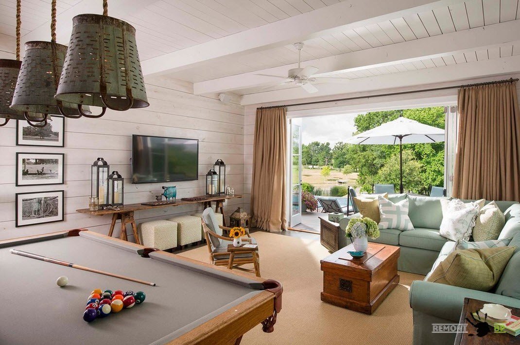Еще один пример гостиной в загородном доме, в чей интерьер игровая зона вписалась весьма органично. В цветовую гамму в пастельных тонах был гармонично интегрирован бильярдный стол со светло-серым сукном. Расположение стола очень удобно тем, что игроки могут без проблем общаться с теми, кто сидит на диване или в кресле и смотрят телевизор или просто беседуют между собой.