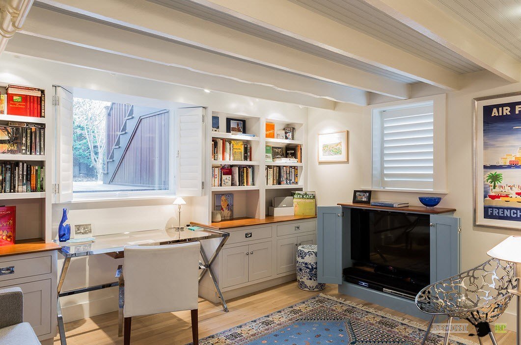 Следующие три образа комнат для отдыха с множеством сопутствующих функций, также расположены в полуподвальных помещениях, но отсутствие больших окон и естественного освещения не мешает им поражать нас комфортной и уютной обстановкой, приятной отделкой и привлекательной цветовой палитрой.