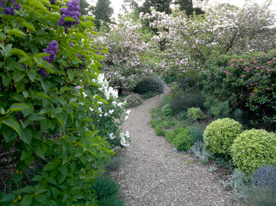 Один из наиболее дешевых вариантов организации безопасного передвижения по участку – насыпной гравий. Единственное, что необходимо учесть – расходного материала потребуется больше обычного, т.к. гравий дает приличную усадку в процессе эксплуатации. И все же для большого участка с центральной аллеей гравий не очень подходит, это идеальный вариант для небольших дорожек между клумбами и грядками.