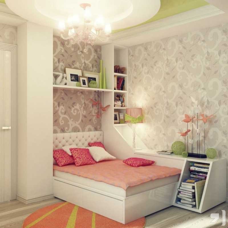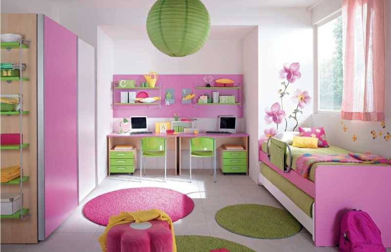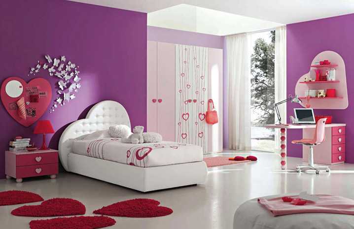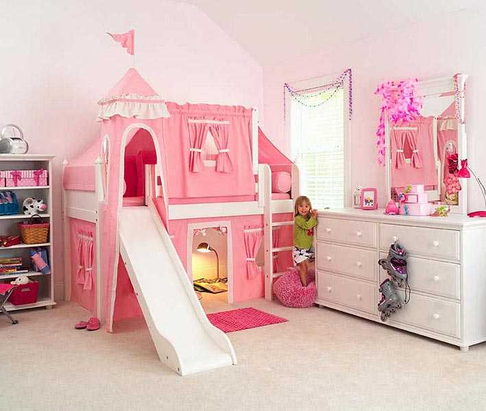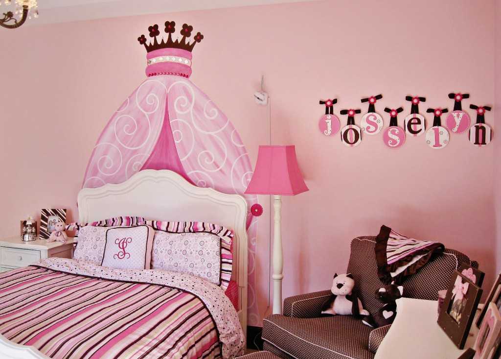 В комнате девочки всегда должно быть уютно. Добиться этого можно, используя декоративные поделки, рамки и семейными фотографиями, сказочные картинки и многочисленные игрушки. На стенах можно изобразить креативный орнамент или наклеить изображения сказочных героев. Как вариант можно нарисовать необычный дворец.