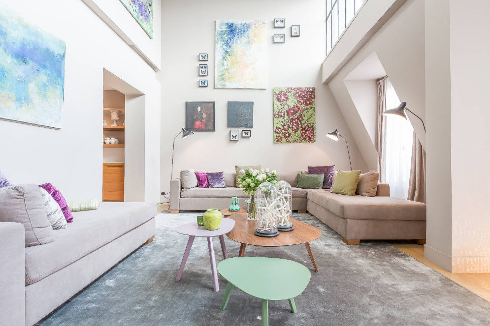 В просторных помещениях нет ограничений в выборе цветовой палитры. Все, кто предпочитает темные, глубокие оттенки или яркие цвета в качестве акцентов, пестрые принты или крупные изображения на текстиле – могут дать волю фантазии. Например, яркая обивка мягкой мебели на фоне колоритного цветового исполнения отделки – сочетание, которое стандартные квартиры просто не могут себе позволить.
