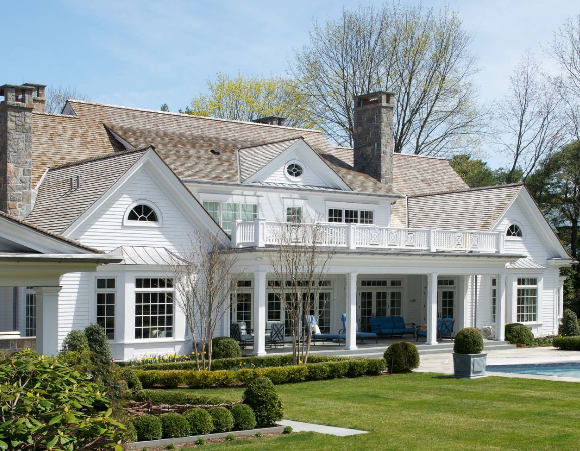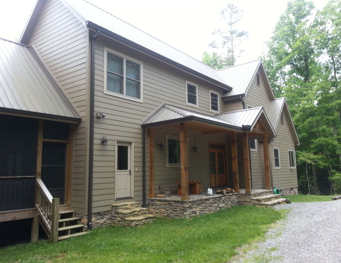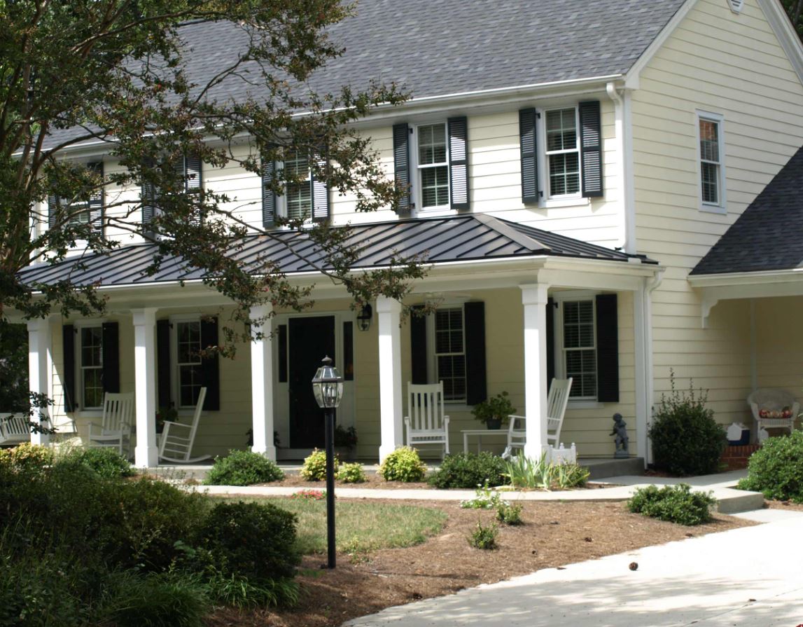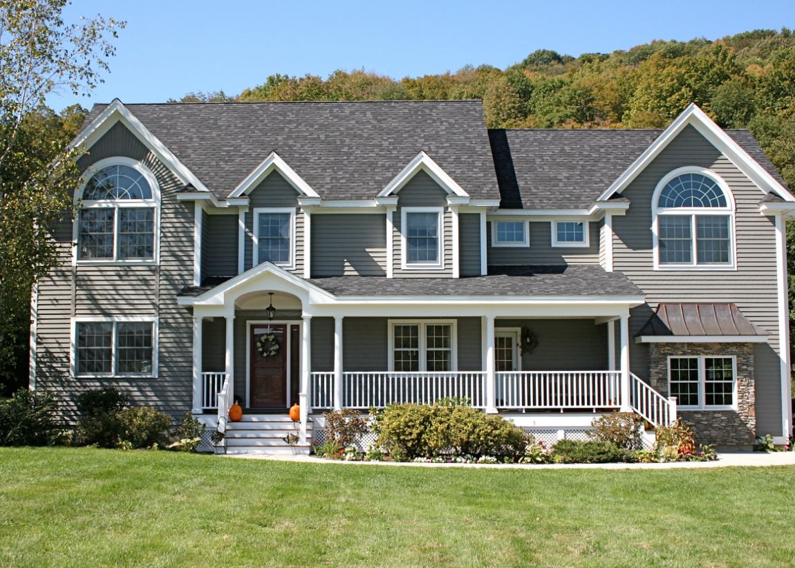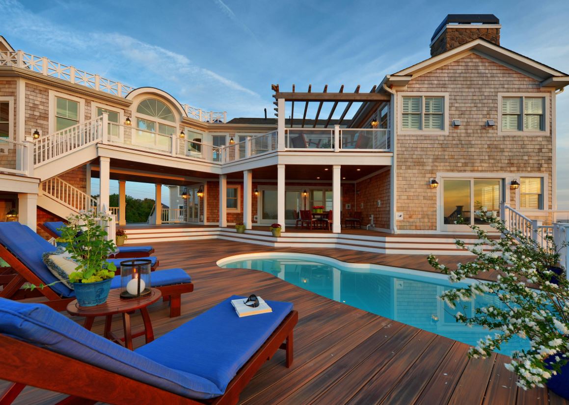 В масштабном доме пристраивают большое крыльцо, где обустраивают зону отдыха. Хорошим решением для навеса является железный материал. Такой навес, как правило, оформляют фонарями и вазонами. Для отделки выбирают поликарбонат, металлочерепицу, профнастил, шифер.
