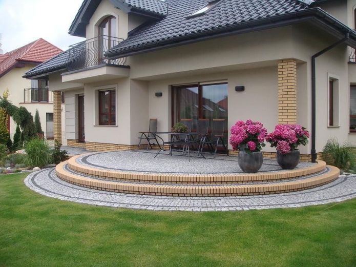 Полукруглая пристройка к дому похожа на круглое крыльцо, но с одной стороны обустроена парапетом и декорируется клумбой с цветами. Благодаря полукруглым ступеням, такое сооружение считается менее травмоопасным и отлично гармонирует с любой облицовкой дома.
