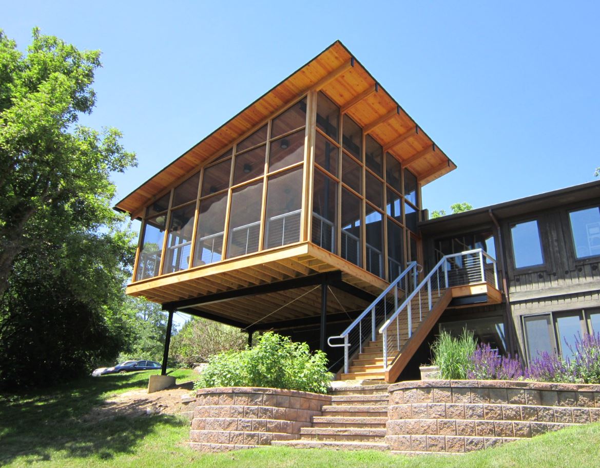 Закрытое крыльцо представляет собой застекленную пристройку. Для того, чтобы такое крыльцо смотрелось гармонично со всем домом, при отделке кровли используют такое же покрытие, что и на крыше дома.