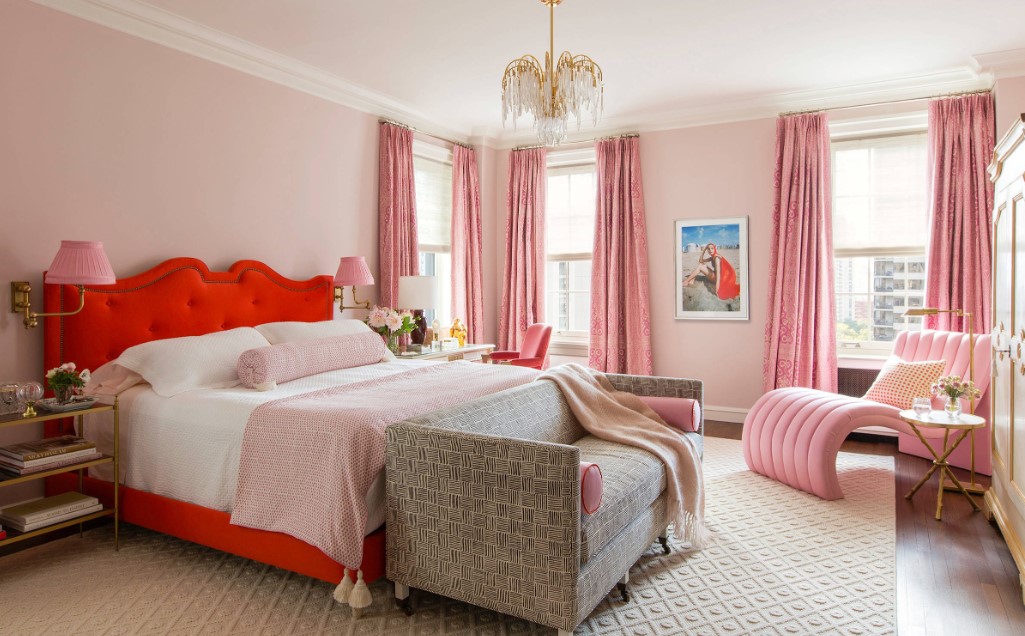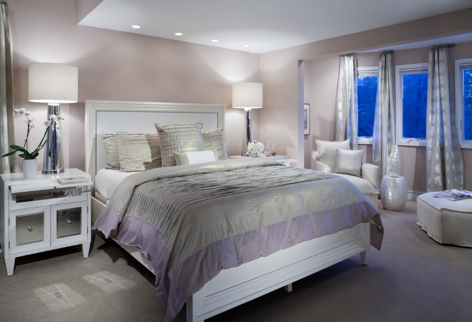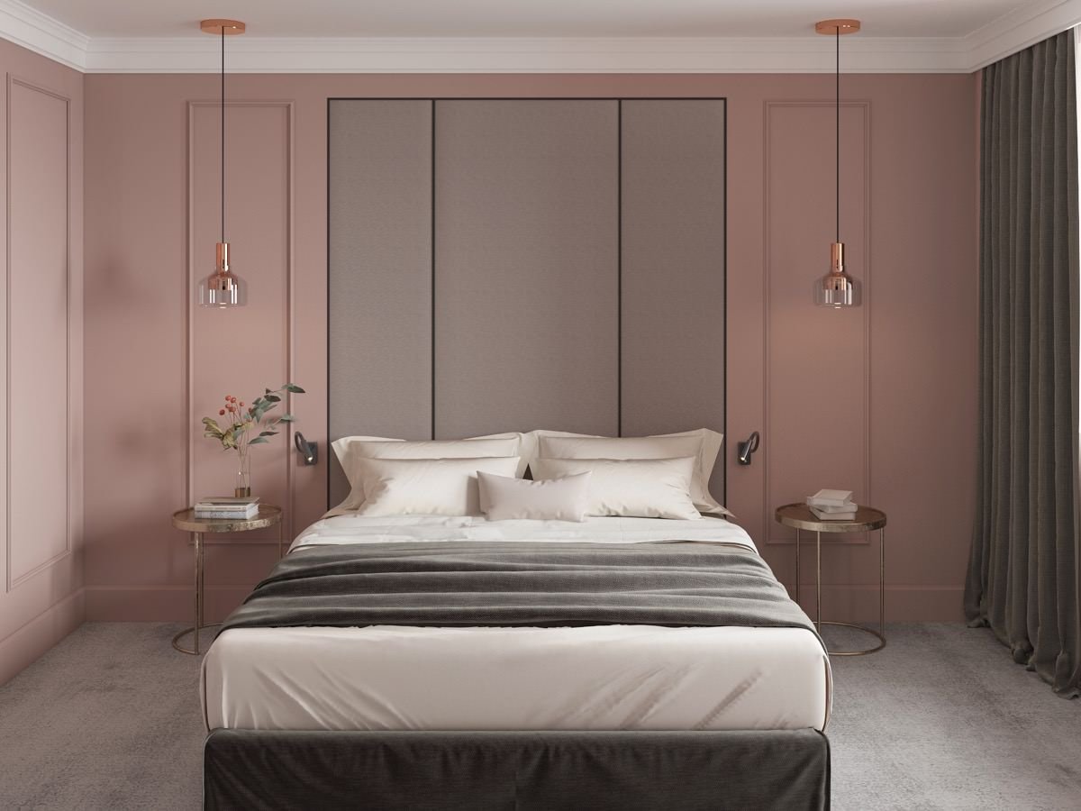 - Особенности интерьера серо-розовой спальни