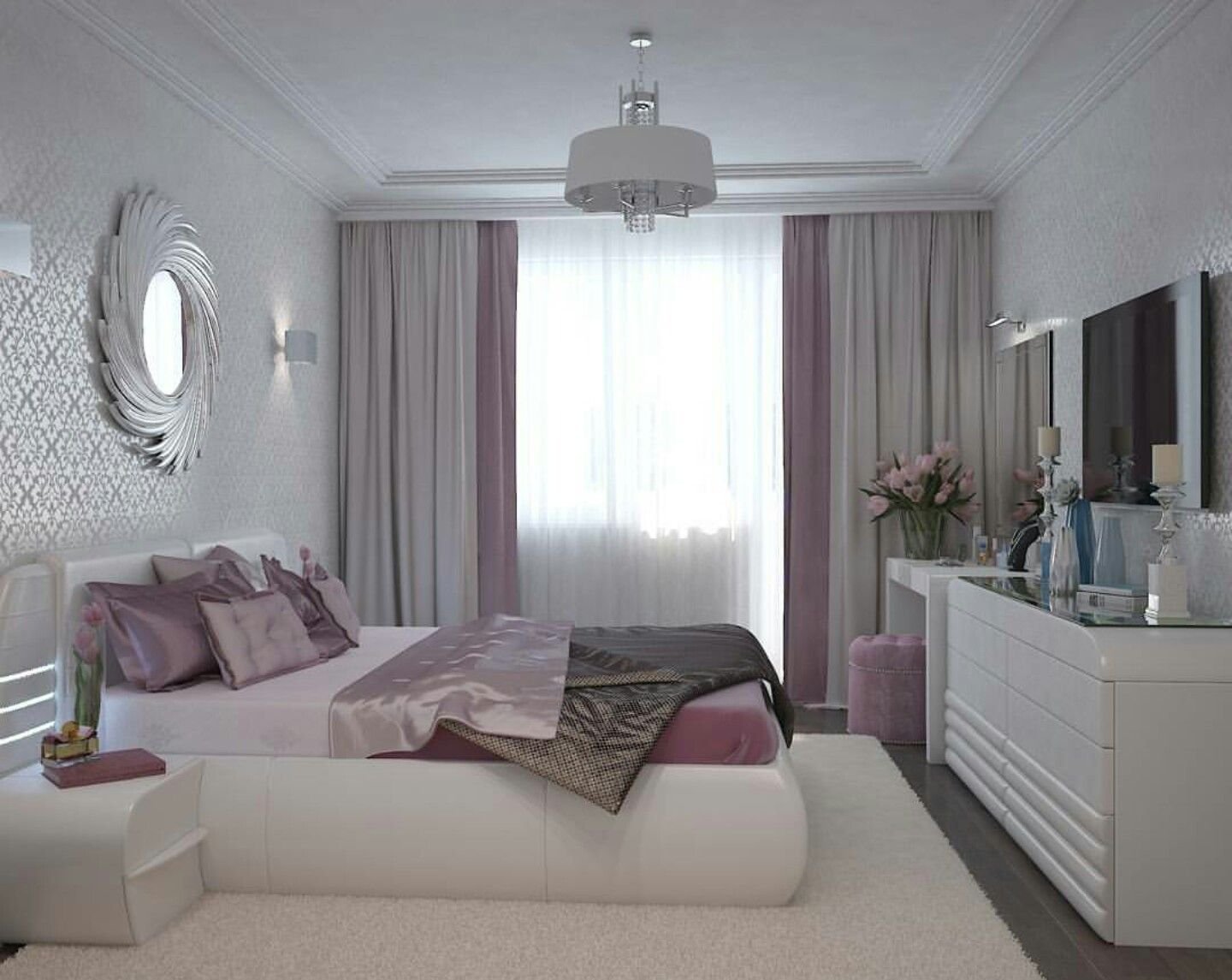 Вся мебель, подбираемая для серо-розовой спальни, должна быть современной, качественной, желательно, выполненной в светлой цветовой гамме.