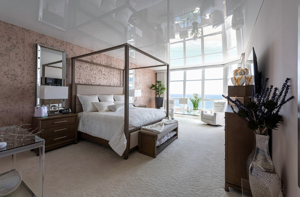 Вообще, отделочный материал играет очень важную роль в оформлении домашнего интерьера спальной комнаты. Потолок можно выполнить натяжного плана из матового или, наоборот, гладкого глянцевого материала. И лучше, если в цветовом решении, это будет мягкий, нейтральный или вообще чисто белый цвет – тогда он будет сочетаться со стенами и другими предметами интерьера.