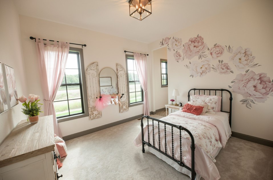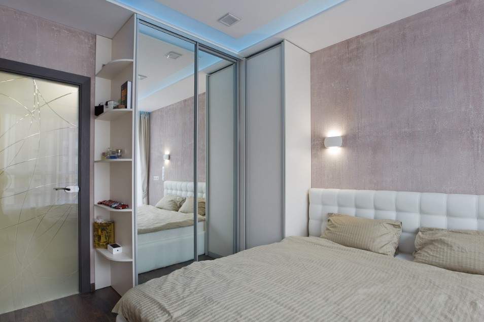 Если в комнате есть шкаф-купе, в нем можно заменить обыкновенные дверцы на зеркала с узором. Обязательно стоит добавить мягких и уютных пуфов, желательно с оборкой из пушистого розового или белого плюша – такой вариант подойдет для оформления детской или подростковой спальни.